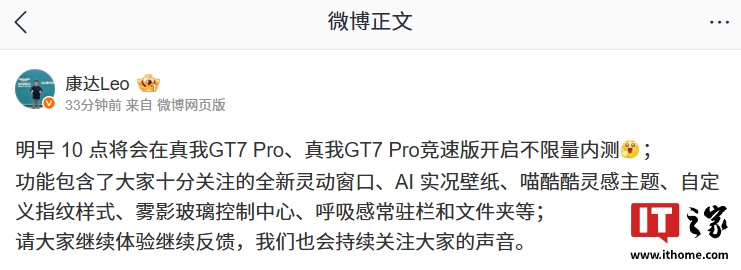 IT之家 11 月 5 日消息,真我社区今日发布公告,宣布 realme UI 7.0 第一轮不限量内测用户招募将于 11 月 6 日(明日)正式开启。realme UI 版主 / 管理员表示,经过工程师慎重评估版本状态、综合体验和性能,选定真我 GT7 Pro、真我 GT7 Pro 竞速版作为第一轮不限量内测招募机型。